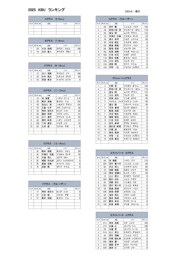 2025年8月1日時点のKBU定期戦ランキング表です。